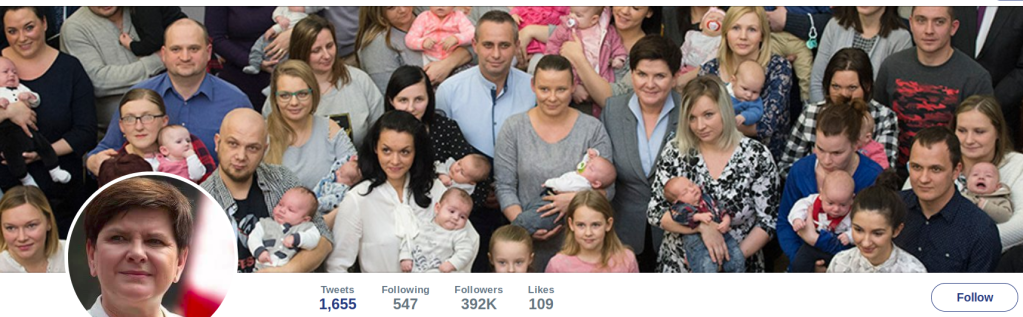 Das twitter-Startbild der der Beata Szydło (PiS) zeigt auch ein Verständnis von Beschäftigung und sozialen Angelegenheiten: weißt sein und viele Kinder kriegen.