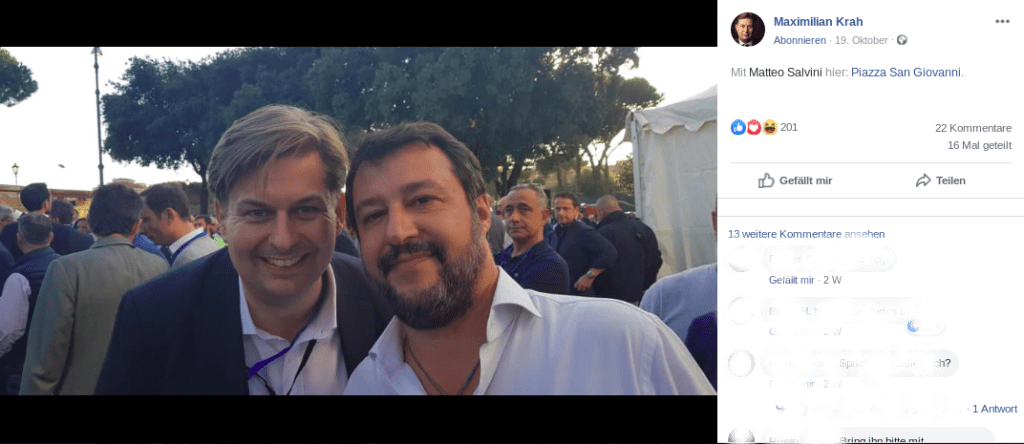 Während Zimniok also in Großbritannien netzwerkte, tummelte sich MEP Maximilian Krah (ebenfalls AfD) im Süden und nahm an einer Demonstration unter dem Titel Orgoglio Italiano (Stolz Italiens) in Rom teil. Dort traf er sich mit Matteo Salvini, dem ehemaligen Innenminister und stellvertretenden Ministerpräsidenten, vor allem aber Vorsitzenden der Lega.